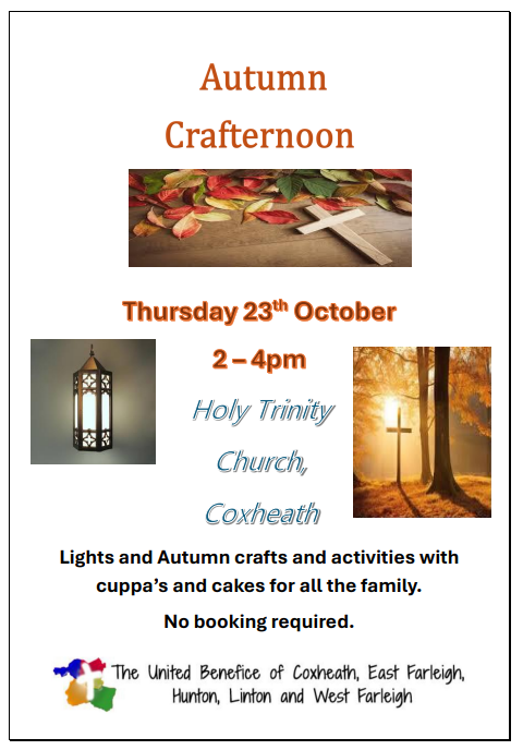 Autumn Crafternoon in Coxheath Event Details Date: 23/10/2025 2:00 pm – 4:00 pm Venue: Holy Trinity, Coxheath Categories: CFW, Coxheath Lights and Autumn crafts and activities with cuppa’s and cakes for all the family. No booking required.