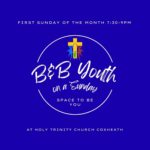 B&B Youth on a Sunday at Coxheath Event Details This event is running from 3 October 2021 until 3 December 2028. It is next occurring on 01/03/2026 7:30 pm Venue: Holy Trinity, Coxheath Categories: BBall, BByouth, BByouthSunday, CFW, Coxheath Upcoming Dates: 01/03/2026 7:30 pm – 9:00 pm05/04/2026 7:30 pm – 9:00 pm03/05/2026 7:30 pm – 9:00 pm07/06/2026 7:30 pm – 9:00 pm05/07/2026 7:30 pm – 9:00 pm02/08/2026 7:30 pm – 9:00 pm06/09/2026 7:30 pm – 9:00 pm04/10/2026 7:30 pm – 9:00 pm01/11/2026 7:30 pm – 9:00 pm06/12/2026 7:30 pm – 9:00 pm03/01/2027 7:30 pm – 9:00 pm07/02/2027 7:30 pm – 9:00 pm07/03/2027 7:30 pm – 9:00 pm04/04/2027 7:30 pm – 9:00 pm02/05/2027 7:30 pm – 9:00 pm06/06/2027 7:30 pm – 9:00 pm04/07/2027 7:30 pm – 9:00 pm01/08/2027 7:30 pm – 9:00 pm05/09/2027 7:30 pm – 9:00 pm03/10/2027 7:30 pm – 9:00 pm07/11/2027 7:30 pm – 9:00 pm05/12/2027 7:30 pm – 9:00 pm02/01/2028 7:30 pm – 9:00 pm06/02/2028 7:30 pm – 9:00 pm05/03/2028 7:30 pm – 9:00 pm02/04/2028 7:30 pm – 9:00 pm07/05/2028 7:30 pm – 9:00 pm04/06/2028 7:30 pm – 9:00 pm02/07/2028 7:30 pm – 9:00 pm06/08/2028 7:30 pm – 9:00 pm03/09/2028 7:30 pm – 9:00 pm01/10/2028 7:30 pm – 9:00 pm05/11/2028 7:30 pm – 9:00 pm03/12/2028 7:30 pm – 9:00 pm Click here to find out more about B&B Youth on a Sunday