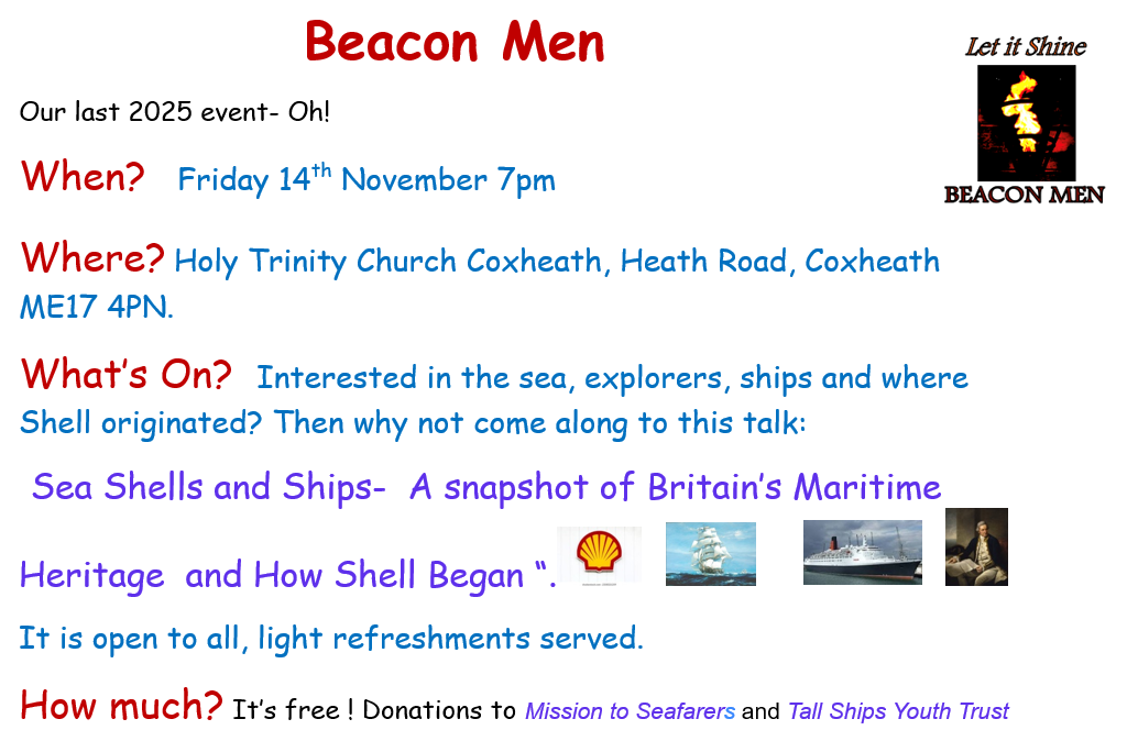 “Sea Shells and Ships” our maritime heritage – Talk by Mike Marsh Event Details Date: 14/11/2025 7:00 pm – 9:30 pm Venue: Holy Trinity, Coxheath Categories: Beacon Men
